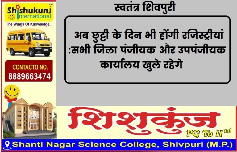 READ MOREशिवपुरी। आज महानिरीक्षक पंजीयक एवं अधीक्षक मुद्रांक मध्यप्रदेश द्धारा अपने सभी कार्यालयों को निर्देश जारी किए है। जिसके चलते अब