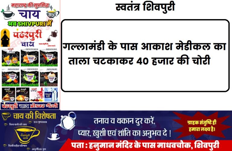 READ MOREशिवपुरी। शहर के सिटी कोतवाली थाना क्षेत्रांतर्गत गल्ला मंडी की दुकानों में स्थित आकाश मेडीकल स्टोर के ताले चोरों ने