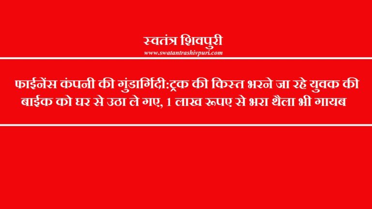 READ MOREशिवपुरी। खबर शहर के सिटी कोतवाली क्षेत्र के शिव कॉलोनी से आ रही है। जहां फायनेंस कंपनी की गुण्डागिर्दी देखने