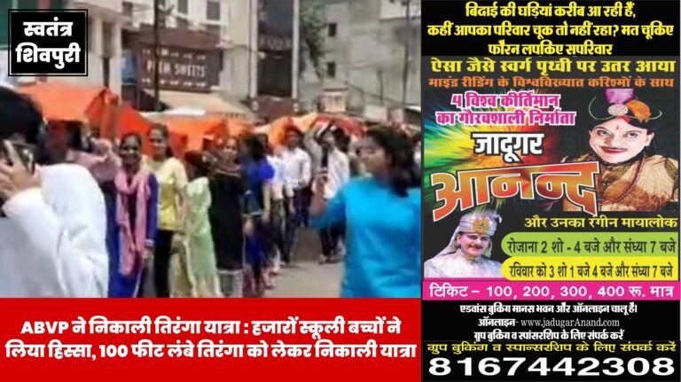 READ MOREशिवपुरी। अखिल भारतीय विद्यार्थी परिषद की नगर इकाई के द्वारा आज 100 फीट लंबे तिरंगा को लेकर तिरंगा यात्रा निकाली।