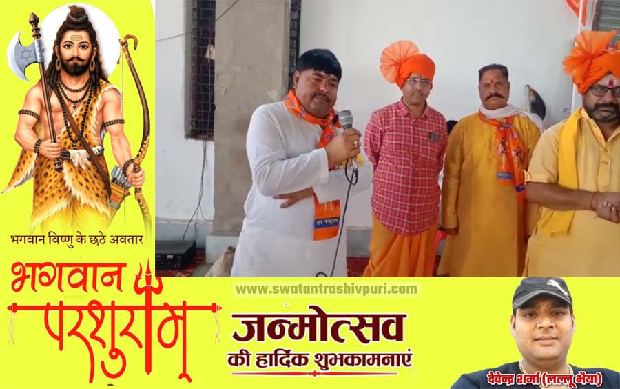 शिवपुरी। आज परशुराम जन्मोत्सव पर पूरे देश में भगवान परशुराम जी का जन्मदिन पूरे धूमधाम से मनाया जा रहा है। इसी के चलते आज नरवर नगर में परशुराम जयंती के उपलक्ष्य में भव्य चल समारोह का आयोजन किया गया । जिसमें नरवर में बस स्टैंड पर स्थित पाताली हनुमान जी के मंदिर से होकर नगर के मुख्य मार्गों से होते हुए लोड़ी माता के प्रांगण से मुबारकपुर हनुमान जी के मंदिर पर पहुंचकर संपन्न हुआ।