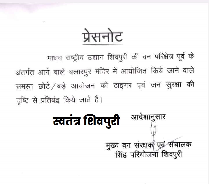 यहां हम बता दे कि बलारपुर मंदिर पर 24 मई से विशाल सतचंडी यज्ञ का आयोजन होना है। बलारी माता मंदिर के महंत प्रयाग भारती ने मंदिर पर मई महीने में शतचंडी यज्ञ की तैयारी में है। इस यज्ञ के लिए उन्होंने शासन और प्रशासन को पत्र लिख कर यज्ञ की अनुमति मांगी थी,अनुमति के पत्र पर विचार करने से पूर्व ही माधव नेशनल पार्क के सीसीएफ उत्तम शर्मा ने मंदिर प्रवेश पर पूर्ण: प्रतिबंधित कर दिया है,केवल महंत और पुजारी को मंदिर पर सुबह 7 बजे से शाम 7 बजे तक जाने की परमिशन रहेगी।