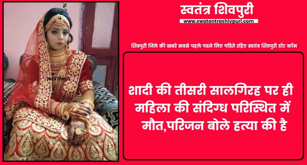 शिवपुरी। खबर जिले के अमोला थाना क्षेत्र नंदपुर नयागांव अमोला से आ रही है। जहां अपनी शादी की सालगिरह के दिन ही एक महिला की संदिग्ध परिस्थित में मौत हो गई। इस मामले में मृतिका के मायके पक्ष के लोग हत्या का आरोप लगा रहे है। इस मामले में पुलिस मामले की जांच में जुट गई है।