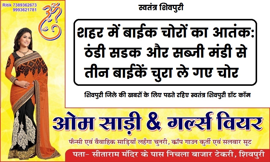 शिवपुरी। खबर शहर के सिटी कोतवाली क्षेत्र के ठंडी सड़क और सब्जी मंडी से तीन बाइके चोर चुरा ले गए। जिसकी शिकायत बाइक मालिकों ने कोतवाली में दर्ज कराई है। पुलिस ने तीनों मामलो में भादवि की धारा 379 के तहत प्रकरण पंजीबद्ध कर लिया है।