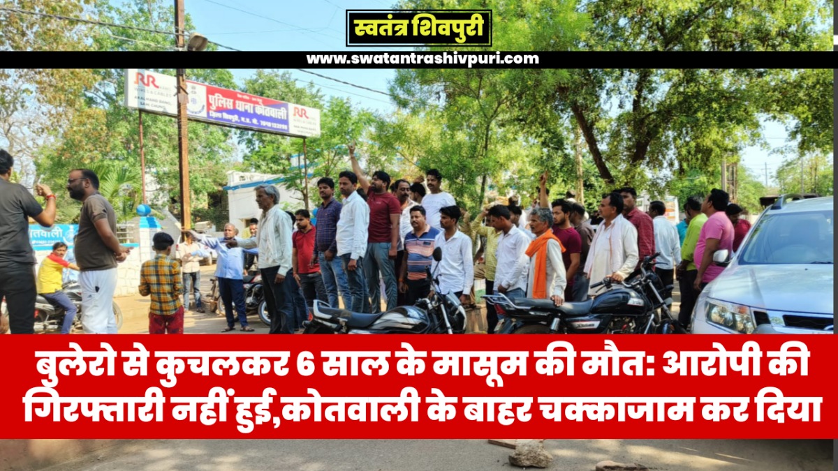 शिवपुरी। अभी अभी खबर शहर के सिटी कोतवाली के बाहर से आ रही है जहा कल एक 6 साल के मासूम की बुलैरो से कुचल जाने के बाद मौत से गुस्साए परिजनों ने आज सुबह सुबह कोतवाली के बाहर चक्काजाम कर दिया है। इस मामले में परिजन आरोपी की गिरफ्तारी की मांग पर अड़े है।