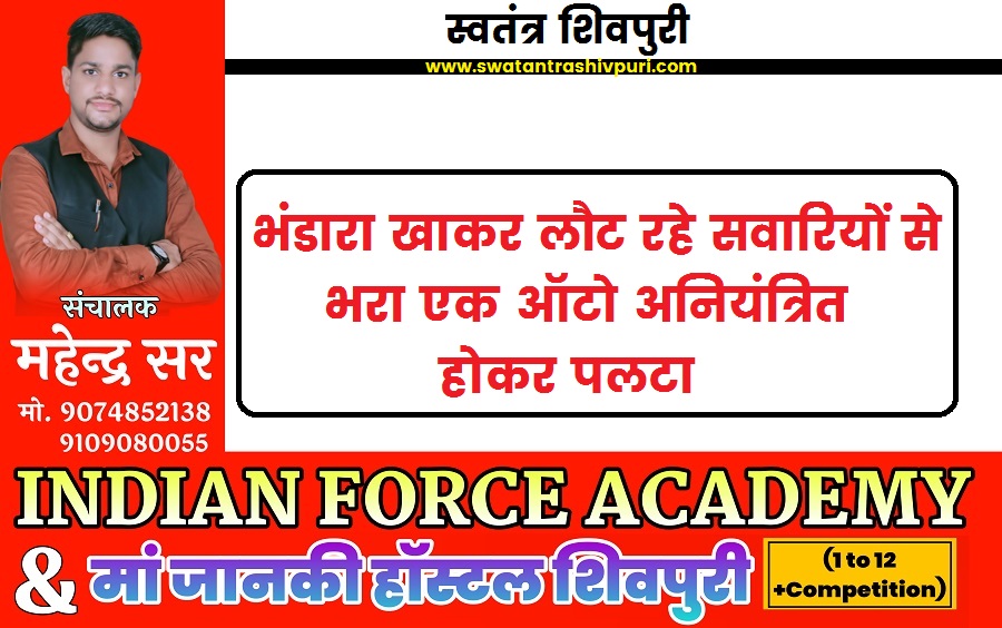 जानकारी के अनुसार आज शाम पुरानी शिवपुरी के तलैया मोहल्ला के रहने वाले रजक समाज के लोग खूबत घाटी पर स्थित ख़ूबत बाबा मंदिर पर आयोजित एक कार्यक्रम में भंडारा खाकर ऑटो में सवार होकर वापस लौट रहे थे। इसी दौरान ऑटो खूबत घाटी के पास
