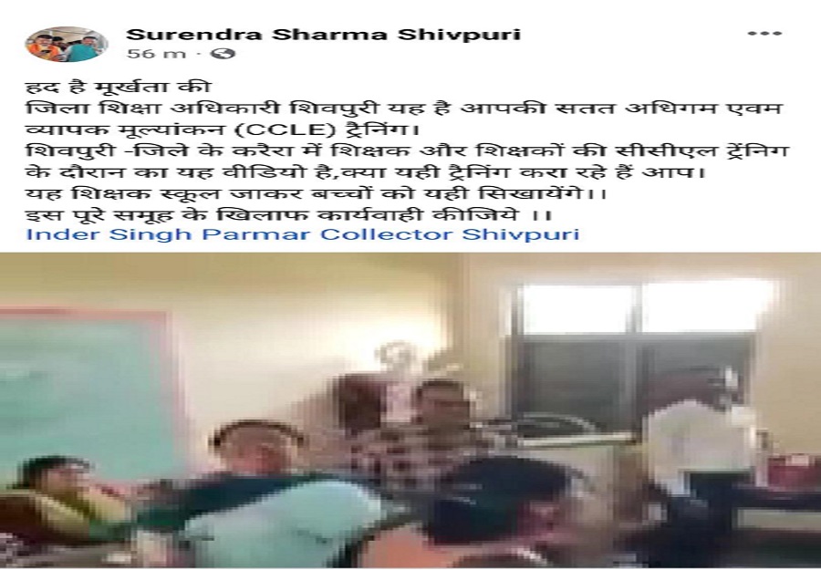 इस मामले पर भाजपा के पूर्व प्रदेश प्रवक्ता सुरेंद्र शर्मा ने भी आपत्ति जताई और फेसबुक पर पोस्ट की। फेसबुक पर लिखा कि हद है मूर्खता की, जिला शिक्षा अधिकारी शिवपुरी यह है आपकी सतत अधिगम एवम व्यापक मूल्यांकन (CCLE) ट्रैनिंग। शिवपुरी -जिले के करैरा में शिक्षक और शिक्षकों की सीसीएल ट्रेंनिग के दौरान का यह वीडियो है,क्या यही ट्रैनिंग करा रहे हैं आप। यह शिक्षक स्कूल जाकर बच्चों को यही सिखायेंगे।। इस पूरे समूह के खिलाफ कार्रवाई कीजिये।