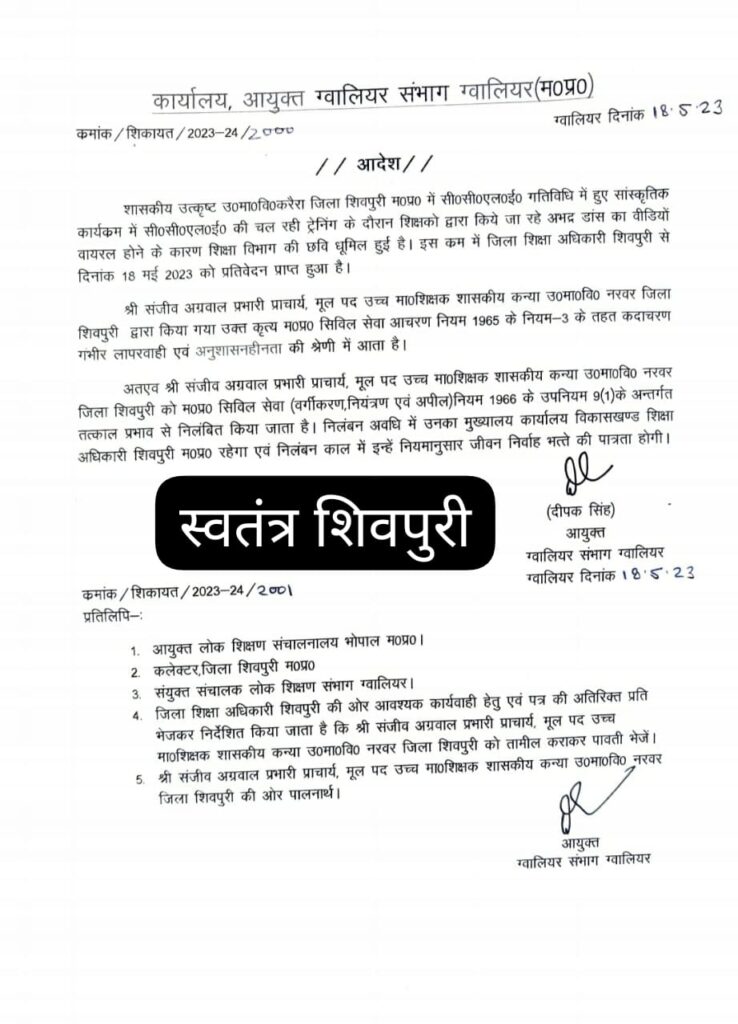ग्वालियर। आज स्वतंत्र शिवपुरी की खबर का बड़ा असर हुआ है। स्वतंत्र शिवपुरी द्वारा वायरल वीडियो को संज्ञान में लेते हुए संभागीय आयुक्त दीपक सिंह ने शासकीय उत्कृष्ट उच्चतर माध्यमिक विद्यालय करैरा जिला शिवपुरी में सी०सी०एल०ई० गतिविधि में हुए सांस्कृतिक कार्यक्रम में अभद्र नृत्य के चलते संजीव अग्रवाल प्रभारी प्राचार्य एवं श्रीमती संगीता मांझी प्रभारी प्राचार्य को तत्काल प्रभाव से निलंबित करने के आदेश जारी किए।