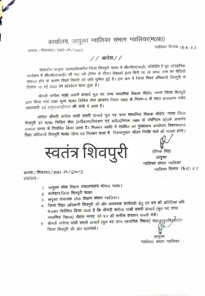 अतएव श्रीमती संगीता मांझी प्रभारी प्राचार्य एवं श्री संजीव अग्रवाल प्रभारी प्राचार्य, मूल पद उच्च मा०शिक्षक शासकीय कन्या उ०मा०वि० नरवर जिला शिवपुरी को म०प्र० सिविल सेवा (वर्गीकरण, नियंत्रण एवं अपील) नियम 1966 के उपनियम 9(1) के अन्तर्गत तत्काल प्रभाव से निलंबित किया जाता है। निलंबन अवधि में उनका मुख्यालय कार्यालय विकासखण्ड शिक्षा अधिकारी शिवपुरी म०प्र० रहेगा एवं निलंबन काल में इन्हें नियमानुसार जीवन निर्वाह भत्ते की पात्रता होगी। यहां हम बता दे कि इस वीडियो को सबसे पहले स्वतंत्र शिवपुरी ने वायरल किया था। इस वीडियो के वायरल होते ही इन प्राचार्यो को बचाने के कई हथकंडे अपनाए थे।
