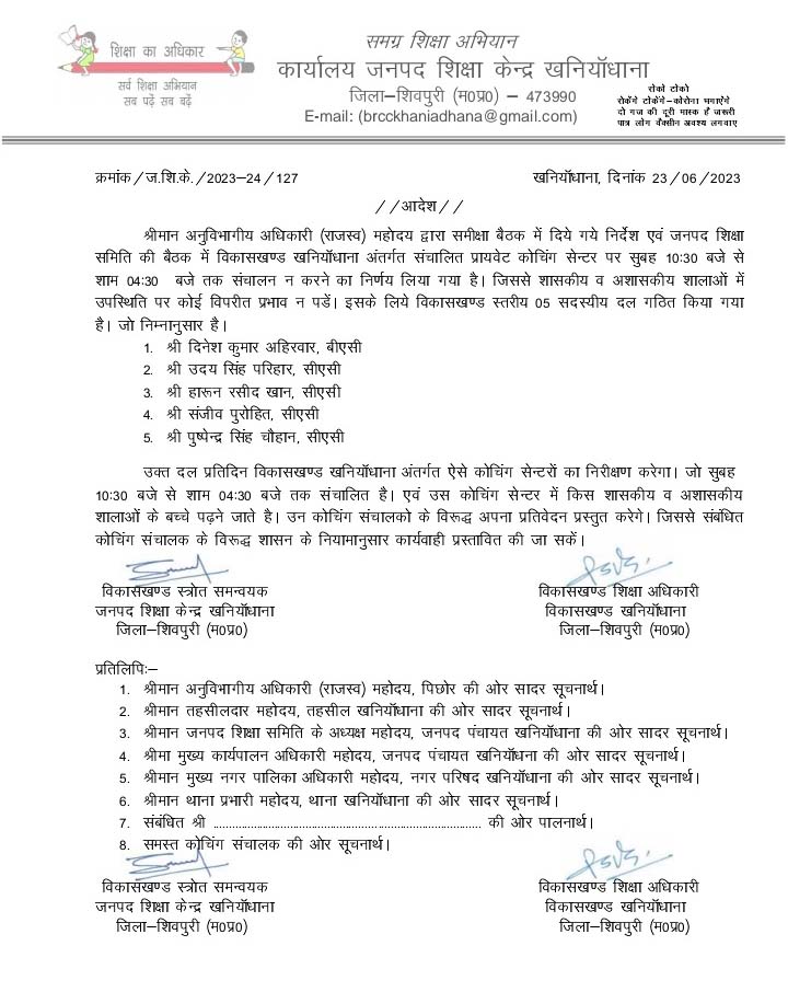 खनियाधाना के ब्लॉक शिक्षा अधिकारी प्रकाश सूर्यवंशी एवं बीआरसीसी संजय भदोरिया को कोचिंग संस्थानों पर निगरानी रखने के लिए निगरानी समिति का गठन करने के निर्देश दिए तथा निगरानी समिति कोचिंग संस्थानों पर निगरानी कर समय समय पर अपना प्रतिवेदन एसडीएम को सौंपेंगे। साथ ही शासकीय शिक्षकों एवं प्राचार्य को भी नियमित कक्षाओं का संचालन और समय पर पाठ्यक्रम पूर्ण करने के कड़े निर्देश दिए गए।
