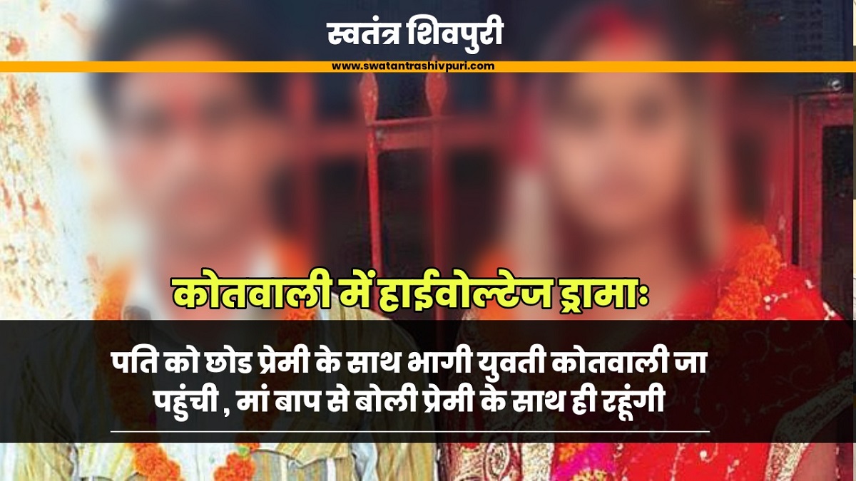 शिवपुरी। खबर सिटी कोतवाली से आ रही है। जहां कल सिटी कोतवाली में हाईवोल्टेज ड्रामा देखने को मिला। एक युवती अपने पति को अपने प्रेमी के साथ फरार हो गई। इस मामले में युवती के परिजनों ने गुमशुदगी पिछोर थाने में दर्ज कराई। जहां उक्त युवती अपने प्रेमी के साथ कोतवाली में जा पहुंची।