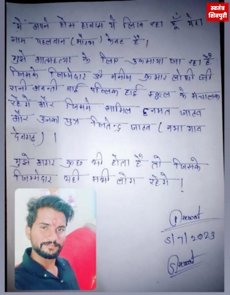 मुझे आत्महत्या के लिए उकसाया जा रहा है जिसके जिम्मेदार मनीष कुमार लोधी जी, रानी अवंती बाई पब्लिक हाई स्कूल के संचालक रहेंगे और जिस में शामिल हनुमत जाटव और उनका पुत्र जितेंद्र जाटव (नया गांव देवगढ़) हैं। मुझे अगर कुछ भी होता है तो जिसके जिम्मेदार यही सभी लोग रहेंगे।