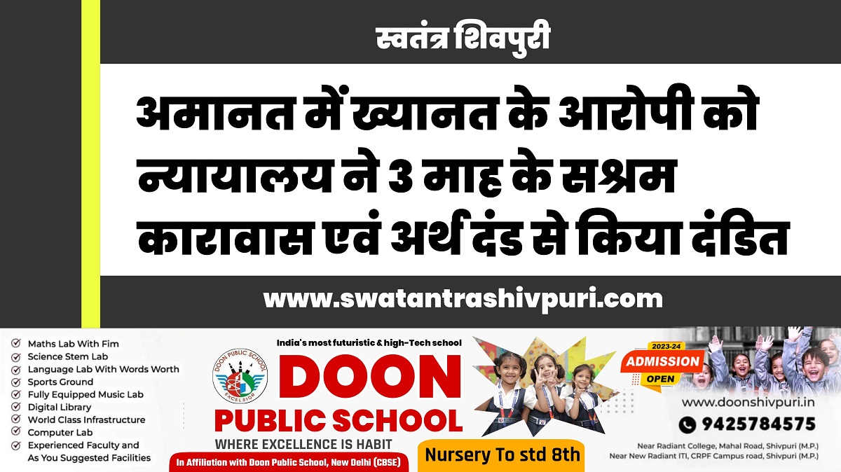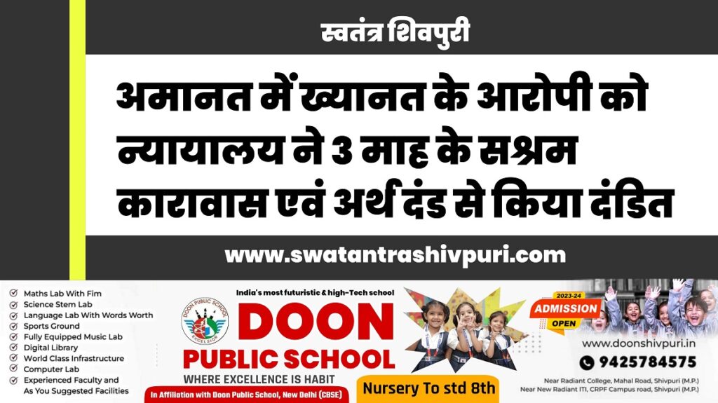 अमानत में ख्यानत के आरोपी को न्यायालय ने 3 माह के सश्रम कारावास एवं अर्थदण्ड से किया दंडित