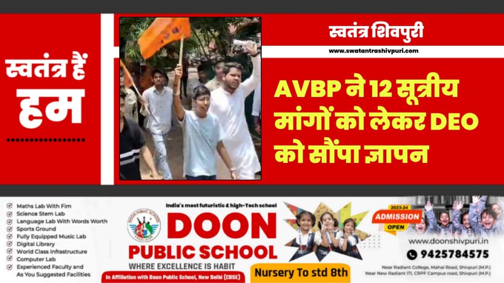 शिवपुरी। खबर जिला मुख्यालय से आ रही है। जहां आज शुक्रवार को अखिल भारतीय विद्यार्थी परिषद के कार्यकर्ताओं ने अशासकीय विद्यालयों में बरती जा रहीं अनियमितताओं के खिलाफ मोर्चा खोलते हुए 12 सूत्रीय मांगों को लेकर जिला शिक्षा अधिकारी को एक ज्ञापन सौंपा है।