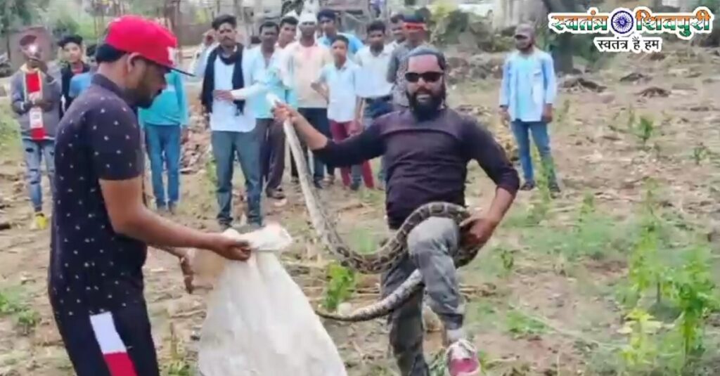नरवर के लोढी माता के मंदिर के पास पेड पर बैठा था 12 फिट का अजगर रेस्क्यू कर नीचे उतारा