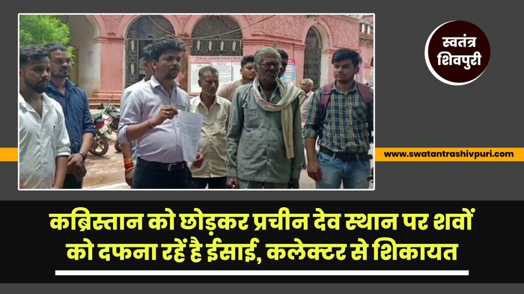 शिवपुरी । खबर जिला कलेक्ट्रेट से आ रही है जहां शहर के सिटी सेंटर कॉलोनी में स्थित के निवासियों ने कॉलोनी में स्थित ईसाई कब्रिस्तान में निर्धारित स्थान छोड़कर बाहर देवस्थान पर शव दफनाये जाने को लेकर कलेक्टर से शिकायत दर्ज की है ईसाई समाज द्वारा शव को निर्धारित कब्रिस्तान की जगह न दफना कर देव स्थान के पास में दफनाना शुरू कर दिया है जिससे सांप्रदायिक सौहार्द विगड़ने की आशंका है इसलिए निवासी मामले की शिकायत लेकर कलेक्टर के पास पहु़चे है और शिकायत दर्ज करायी है।
