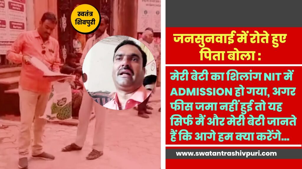 शिवपुरी। आज कलेक्टर कार्यालय में आयोजित जनसुनवाई में एक पिता ने कलेक्टर से रोते हुए अपनी व्यथा सुनाई। पिता ने कलेक्टर को बताया कि मेघालय के शिलांग की यूनिवर्सिटी में उसकी बेटी का एडमीशन हो गया है। अगर ऐसे में उसने फीस जमा नहीं कराई तो उसका एडमीशन नहीं हो पाएगा। अगर बेटी का एडमिशन नहीं हुआ तो यह बात सिर्फ मैं और मेरी ही बेटी ही जानती है कि हम आगे क्या करेंगे।