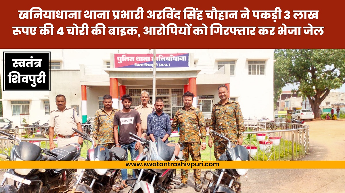 शिवपुरी। पुलिस ने चोरी की चार मोटरसाइकिलों के साथ आरोपियों को गिरफ्तार कर जेल भेजा है। पुलिस अधीक्षक शिवपुरी द्धारा चोरी गये वाहनो को शीघ्र बरामद करने के आदेश पर खनियाधाना पुलिस ने 3 लाख रुपए कीमत की 4 बाइको को बरामद कर आरोपयिों को गिरफ्तार कर लिया है।