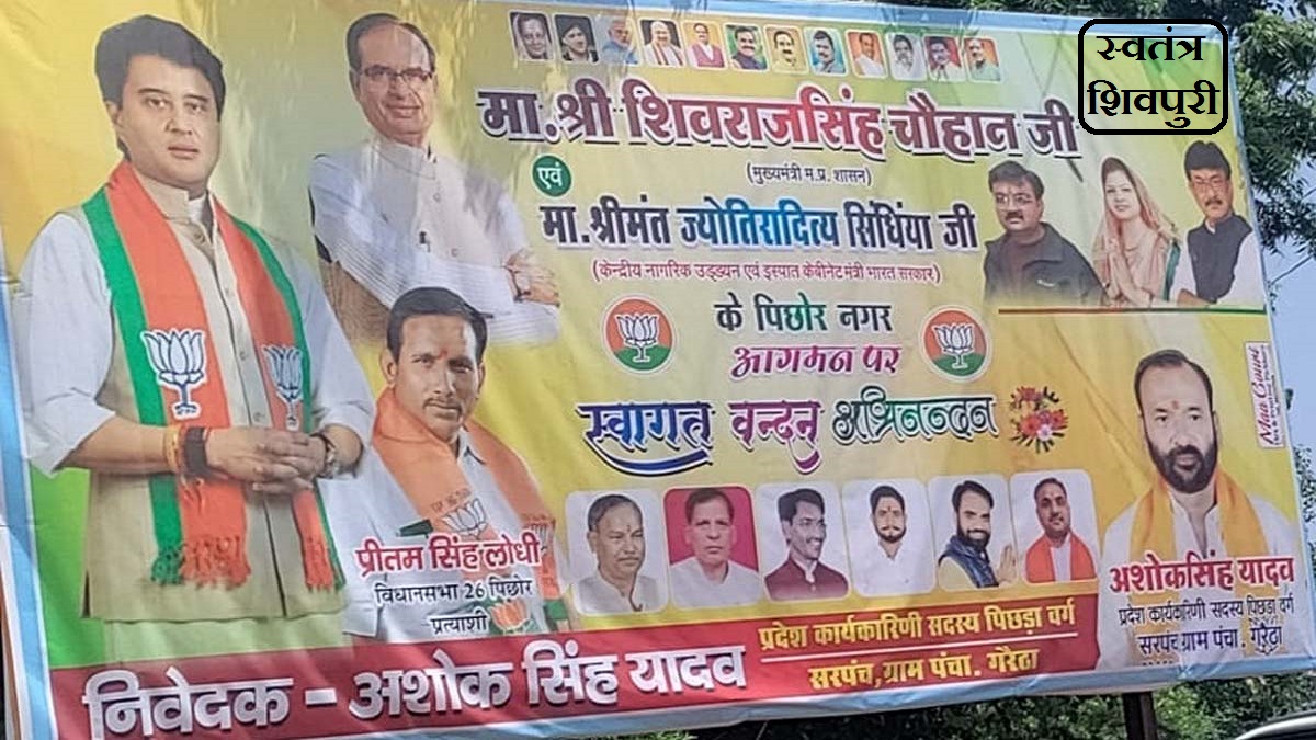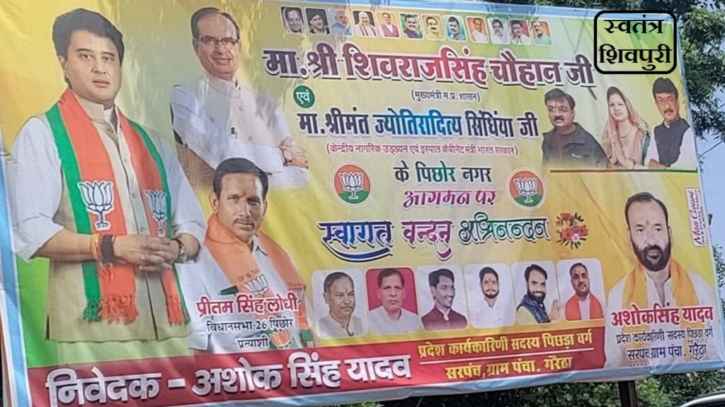 शिवपुरी। कल जिले के पिछोर में सीएम शिवराज सिंह चौहान और केन्द्रीय मंत्री ज्योतिरादित्य सिंधिया का कार्यक्रम में है। इस कार्यक्रम में भाजपा द्धारा पिछोर विधानसभा से घोषित किए गए प्रत्याशी प्रीतम लोधी अपने अपने हिसाब से तैयारीयों में जुट गए है। इसी बीच कल सीएम शिवराज सिंह चौहान और ज्योतिरादित्य सिंधिया पिछोर आ रहे है और यहां एक चुनावी सभा को संबोधित करेंगे। इस दौरान यहां बेनर और पोस्टरों से एक बार फिर क्षेत्रीय सांसद केपी यादव को उपेक्षा का शिकार बनाया गया है। उनके फोटो बैनर और पोस्टरों से गायब है।