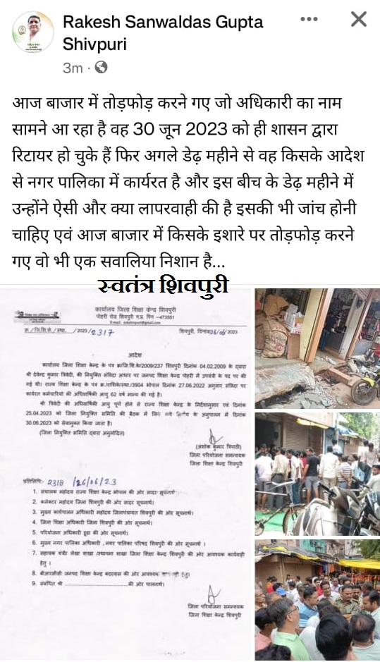 परंतु मौके पर चौका लगाते हुए आज राकेश गुप्ता ने एक पोस्ट शोसल मीडिया पर पोस्ट की है। जिसमें उन्होंने लिखा है कि आज बाजार मेें तोडफोड करने गए जो अधिकारी का नाम सामने आ रहा है वह 30 जून 2023 को शासन द्धारा रिटायर हो चुके है। फिर अगले डेढ महीने से वह किसके आदेश पर नगर पालिका में कार्यरत है। इस बीच के डेढ माह में उन्होंने ऐसी कोई जबरन बसूली तो नहीं कर ली इसकी जांच होना चाहिए। साथ ही व्यापारीयों के साथ इस तरह की बसूली करने बाले आखिर किसके सरक्षण में यहां काम कर रहे है। आज बाजार में किसके इशारे पर तोडफोड करने गए वो भी एक सवालियां निशान है।