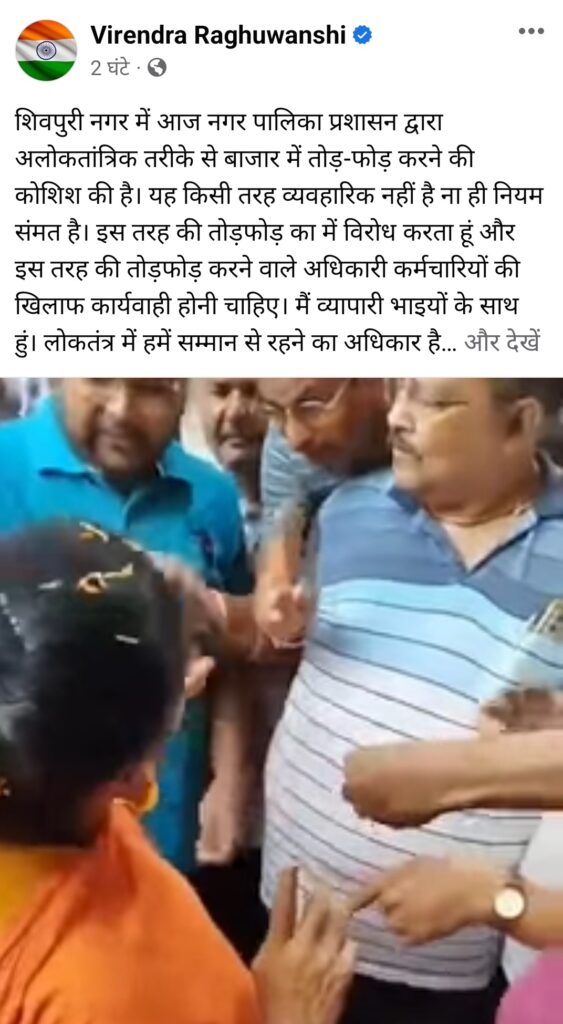 उन्होने अपनी फेसबुक पर पोस्ट करते हुए लिखा है कि शिवपुरी नगर में आज नगर पालिका प्रशासन द्धारा अलोकततांत्रिक तरीके से बाजार में तोडफोड करने की कोशिश की है यह किसी भी तरह से व्यवहारिक नहीं हैै ना ही नियम संमत है। इस तरह की तोडफोड का में विरोध करता हूं और इस तरह की तोडफोड करने बाले अधिकारी कर्मचारीयों की खिलाफ कार्यवाही होना चाहिए। में व्यापारी भाईयों के साथ हूं। लोकतंत्र में हमें सम्मान से रहने का अधिकार है इस तरह की घटना से संपूर्ण पार्टी को शर्मशार होना पडता है।