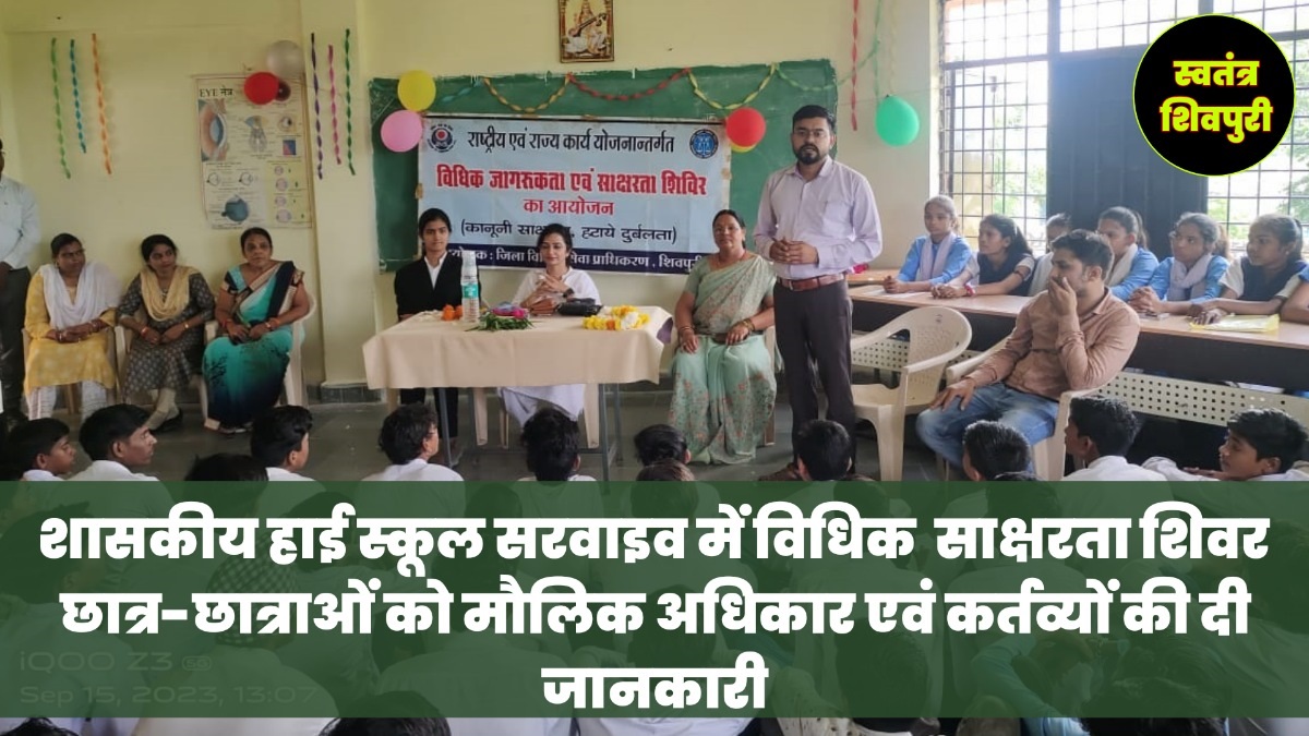 शिवपुरी। शिवपुरी जिले के शासकीय हाइस्कूल सुरवाया में विधिक साक्षरता शिविर का आयोजन किया गया। राष्ट्रीय विधिक सेवा प्राधिकरण नई दिल्ली एवं म.प्र.राज्य विधिक सेवा प्राधिकरण जबलपुर के आदेशानुसार तथा प्रधान जिला एवं सत्र न्यायाधीश दीपक गुप्ता के निर्देशन में तथा जिला न्यायाधीश अर्चना सिंह की अध्यक्षता में गतदिवस शिविर उपस्थित छात्र-छात्राओं को संबोधित करते हुए जिला न्यायाधीश अर्चना सिंह ने बताया कि छात्र हमारे देश का भविष्य हैं, उनका समग्र विकास ही हमारे देश का विकास है एवं मौलिक अधिकार एवं मूल अधिकारों पर प्रकाश डालते हुए उनके द्वारा बताया गया कि संविधान द्वारा प्रदत्त मौलिक कर्तव्यों का पालन करते हुए देश को सर्वोच्चता के शिखर पर ले जा सकते हैं।
