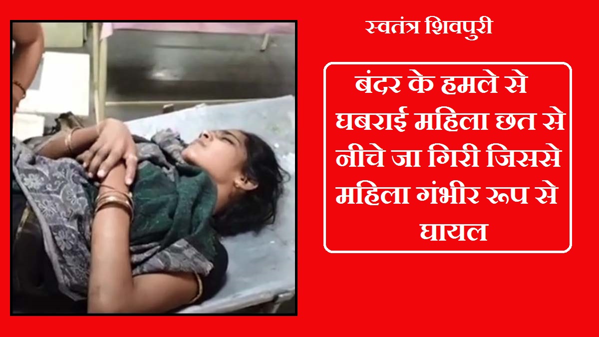 बंदर के हमले से घबराई महिला छत से नीचे जा गिरी जिससे महिला गंभीर रूप से घायल हो गई बता दें कि आम तौर पर शिवपुरी में बंदर कम ही दिखाई देते है। लेकिन आज अचानक से एक बंदर ने महिला पर हमला बोल दिया।