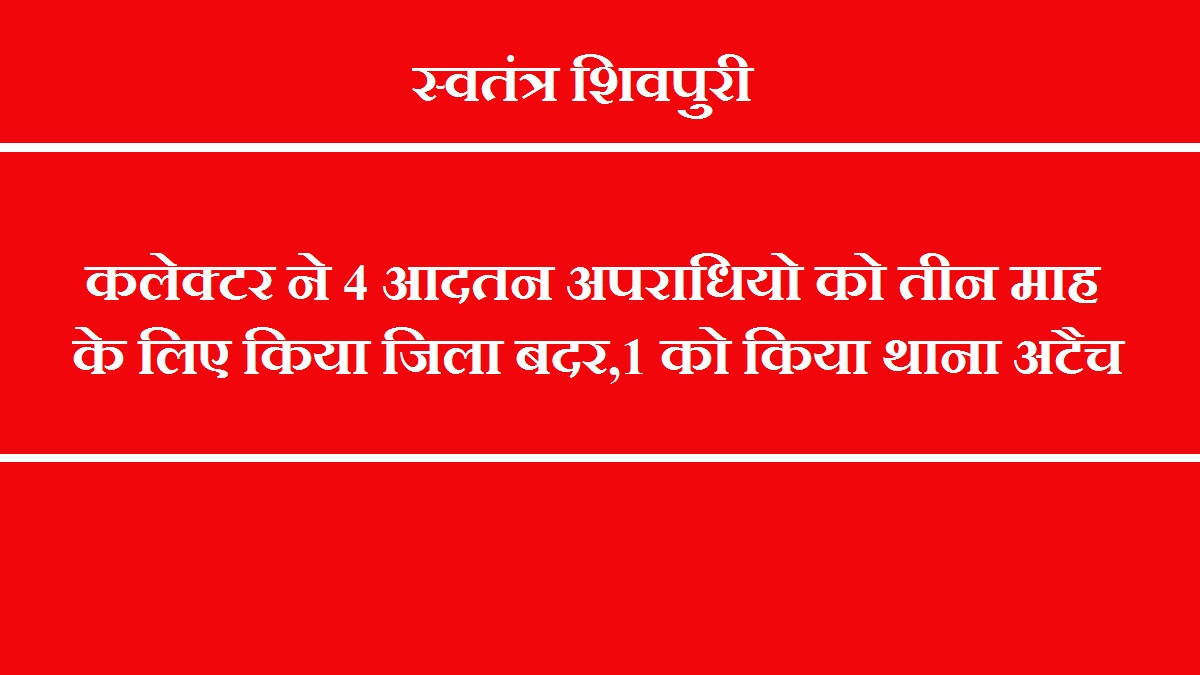 शिवपुरी। कलेक्टर एवं जिला दण्डाधिकारी जिला शिवपुरी द्वारा पुलिस अधीक्षक जिला शिवपुरी की अनुशंसा पर आज जिले के निम्नलिखित 04 अपराधियों को तीन माह के लिये जिलाबदर एवं 01 अपराधी को थाना अटैच किये जाने का आदेश पारित किया।