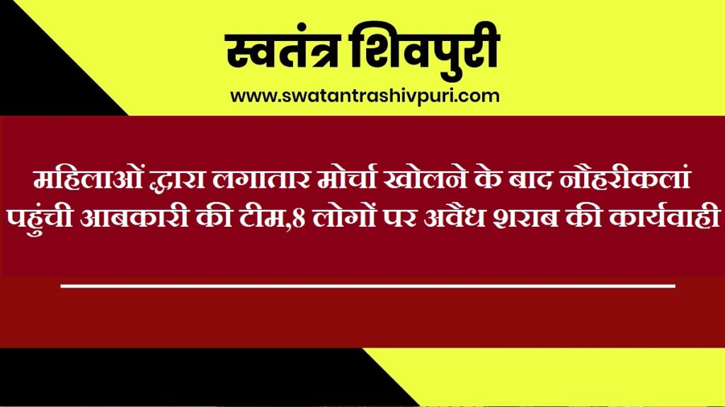 शिवपुरी। बीते चार दिन से नौहरीकलां क्षेत्र की महिलाओं ने इस क्षेत्र में अवैध शराब की विक्री को लेकर मोर्चा खोल दिया था। इस मोर्चे का असर आज देखने को मिला है। इसे लेकर आज कलेक्टर रवीन्द्र कुमार चौधरी ने आबाकारी विभाग को शक्त निर्देश दिए। जिसके चलते आज आबकारी विभाग ने 8 लोगों पर म.प्र. आबकारी अधिनियम 1915 की विभिन्न धाराओं के अन्तर्गत अवैध मदिरा धारण, परिवहन, चौर्यनयन एवं विक्रय के विरूद्ध लगातार कार्यवाही की जा रही है।