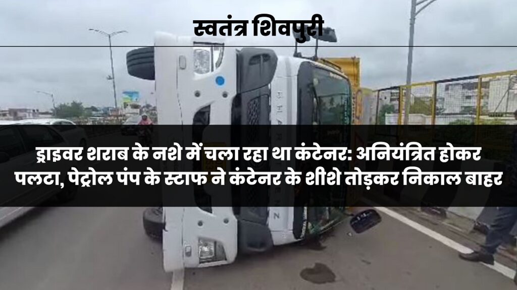 शराब के नशे में चला रहा था कंटेनर: अनियंत्रित होकर पलटा, पेट्रोल पंप के स्टाफ ने कंटेनर के शीशे तोड़कर निकाला बाहर