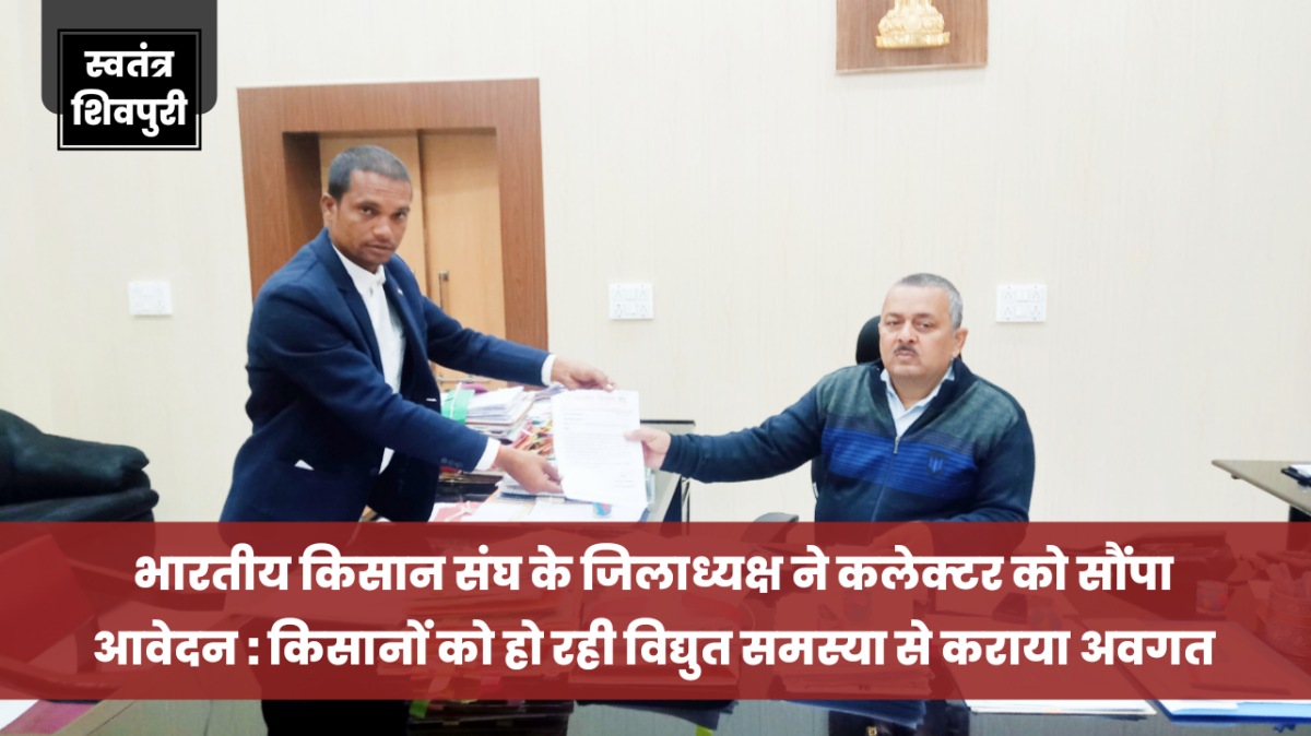 शिवपुरी। खबर जिला कलेक्ट्रेट से आ रही है जहां भारतीय किसान संघ के जिलाध्यक्ष ने जिलेभर में किसानों को हो रही बिजली की समस्या को लेकर आवेदन सौंपा है और अवगत कराते हुए जल्द से जल्द समस्या का निराकरण करने की मांग की है।