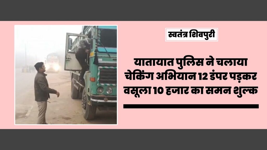 यातायात प्रभारी सूबेदार रणवीर सिंह यादव ने बताया कि आज सुबह पोहरी चौराहा, गुना वायपास, ग्वालियर वायपास, दो बत्ती चौराहा और हवाई पट्टी क्षेत्र में पॉइंट लगाकर डंपरों के दस्तावेजों की जांच की गई थी। आज सभी पॉइंटों पर लगभग 22 डंपरों को चैक किया था। जिनमें से 12 डंपरों के दस्तावेज और कुछ डंपर बिना नंबर प्लेट के पाए गए। सभी 12 डंपरों से कुल 10 हजार का समन शुल्क वसूला गया है।