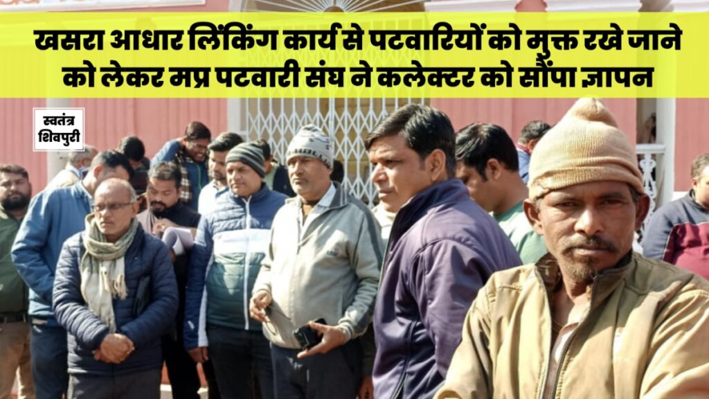 शिवपुरी । खबर कलेक्ट्रेट कार्यालय से आ रही है जहां मप्र पटवारी संघ के जिलाध्यक्ष ने अन्य सदस्यों के साथ खसरा आधार लिंकिंग कार्य से पटवारियों को मुक्त रखे जाने को लेकर कलेक्टर को ज्ञापन दिया है।