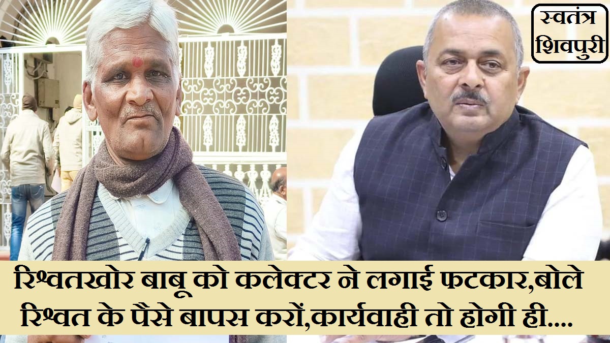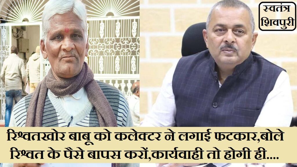 शिवपुरी। आज शिवपुरी कलेक्टर रविन्द्र कुमार चौधरी की दरियादिली उस समय देखने को मिली जब शिवपुरी कलेक्टर रविन्द्र कुमार चौधरी ने एक भ्रष्ट बाबू की जमकर क्लास ली। कलेक्टर रविन्द्र कुमार चौधरी ने इस रिश्वतखोर बाबू को अपने कार्यालय में तलब किया और उन्हें जमकर खरी खोटी सुनाई। उसके बाद रिश्वत के पैसे बापस करने का आदेश बाबू को दिया।