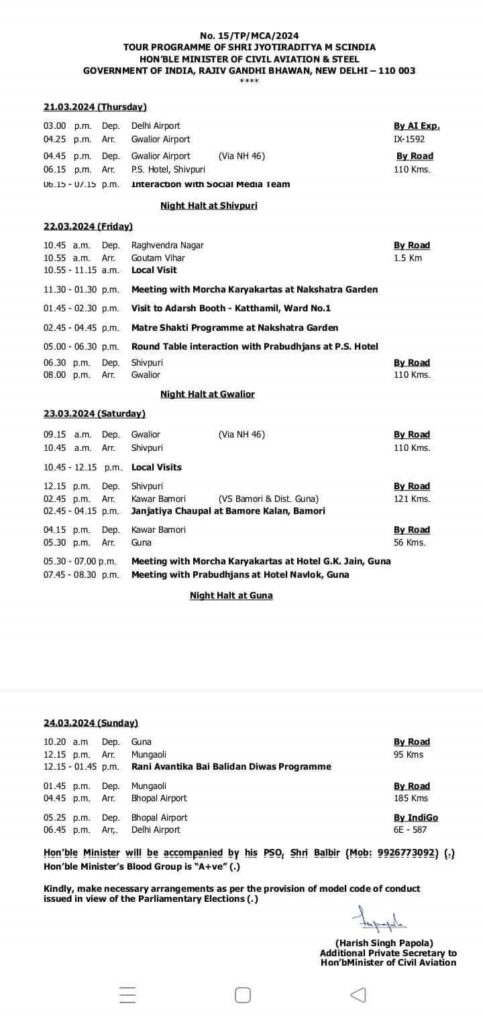 शिवपुरी। गुना शिवपुरी लोकसभा क्षेत्र के भाजपा प्रत्याशी ज्योतिरादित्य सिंधिया 21 मार्च को चार दिवसीय दौरे पर गुना शिवपुरी लोकसभा क्षेत्र में आ रहे है। ज्योतिरादित्य सिंधिया 21 मार्च को 3 बजे दिल्ली एअरपोर्ट से ग्वालियर एयरपोर्ट आएगे। वहां से वह कार से शाम 6: 15 बजे शिवपुरी पहुंचेगें। उसके बाद वह होटल पीएस में शोसल मीडिया टीम से मिलेगे और उन्हें चुनाव को लेकर सक्रिय रहने के तरीके बताएगे।