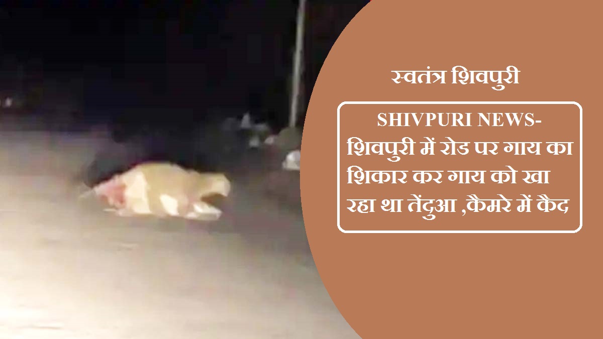 SHIVPURI NEWS- शिवपुरी में रोड पर गाय का शिकार कर गाय को खा रहा था तेंदुआ ,कैमरे में कैद