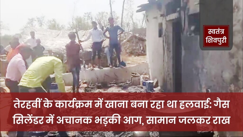 शिवपुरी। खबर जिले के तेंदुआ थाना क्षेत्र से आ रही है। जहां खैरोना गांव में शुक्रवार की दोपहर तेरहवीं का खाना बनाते वक्त अचानक से रसोई गैस सिलेंडर में भीषण आग लग गई। सिलेंडर में आग लगते ही मौके पर अफरातफरी मच गई। मौके पर मौजूद लोगों ने आग को बुझाने का प्रयास किया लेकिन सफलता नहीं मिली।आग से तेरहवीं के खाने का सामान पूरी तरह से जलकर राख हो गया।