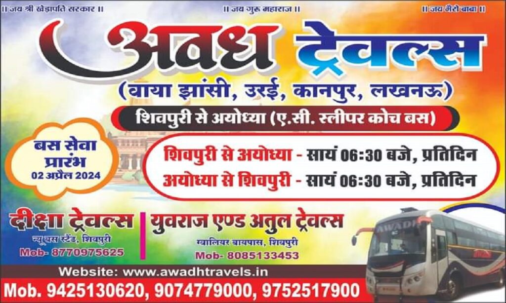 जिसमें दीक्षा ट्रेवल्स शिवपुरी एवं युवराज एण्ड अतुल ट्रेवल्स ग्वालियर द्वारा अवध ट्रेवल्स द्वारा वाया झांसी, उरई,कानपुर एवं लखनऊ होते अयोध्या के लिए एसी स्लीपर कोच बस सुविधा प्रारंभ की हैं।