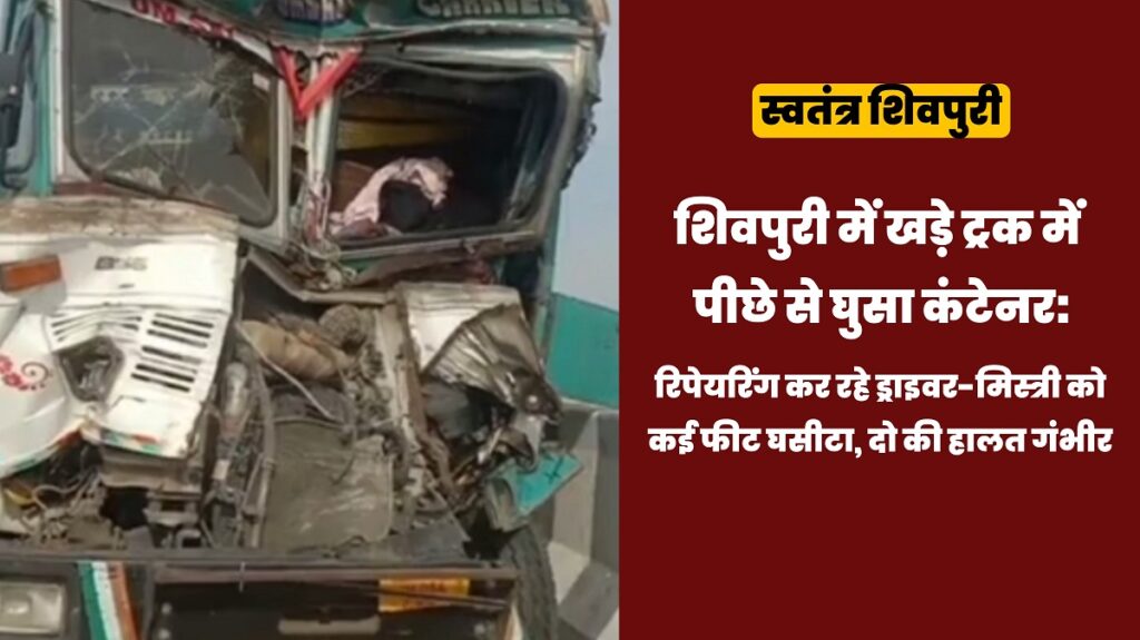 शिवपुरी में खड़े ट्रक में पीछे से घुसा कंटेनर: रिपेयरिंग कर रहे ड्राइवर-मिस्त्री को कई फीट घसीटा, 2 की हालत गंभीर