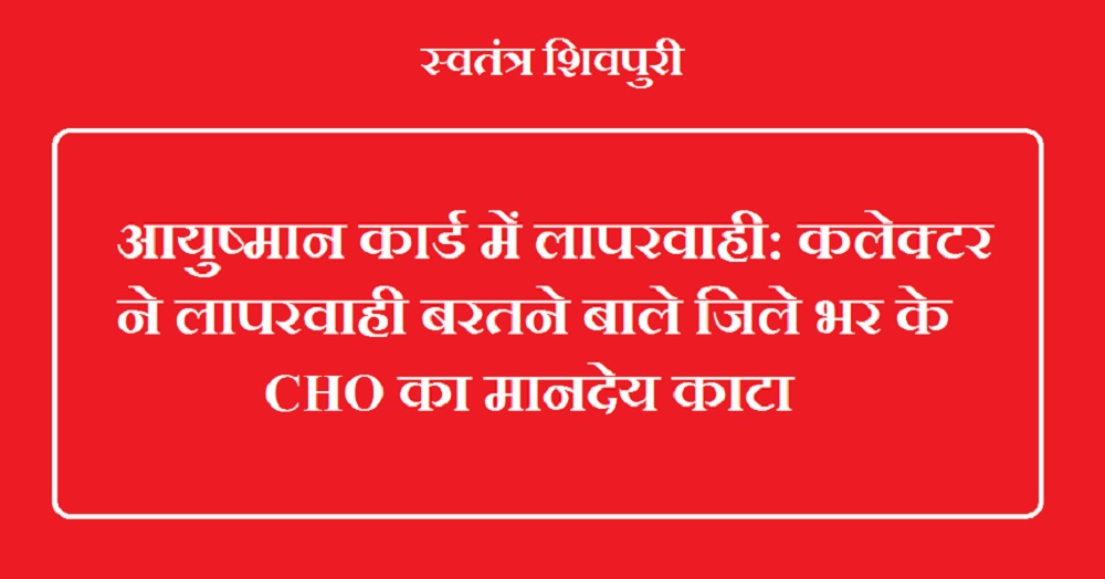 शिवपुरी। कलेक्टर अक्षय कुमार सिंह के निर्देश पर आयुष्मान कार्ड बनाने एवं अन्य राष्ट्रीय कार्यक्रमों की समीक्षा में लापरवाही एवं उदासीनता बरतने वाले सीएचओ के विरूद्ध मानदेय काटे जाने की कार्यवाही की है।