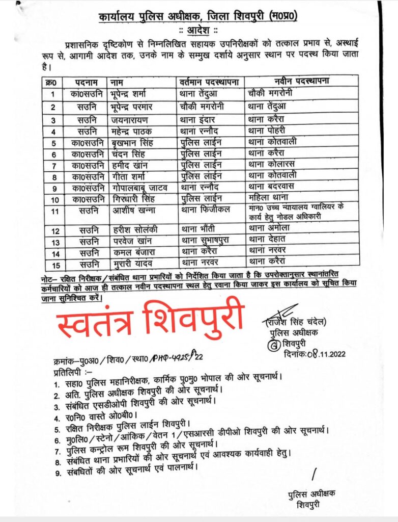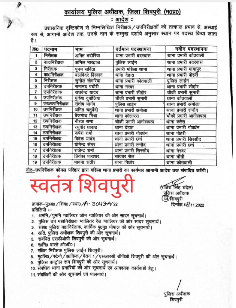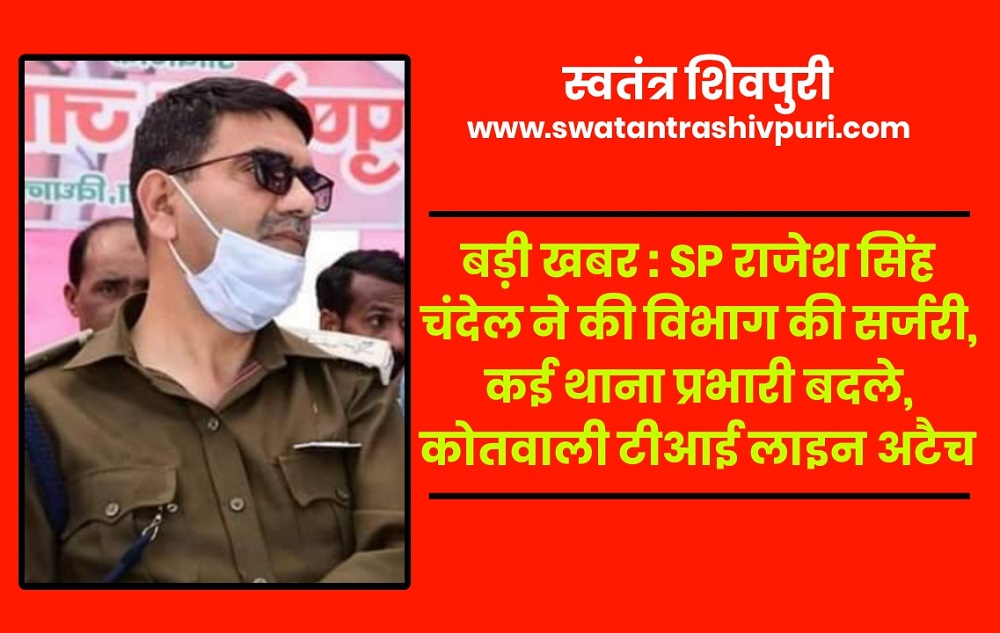 शिवपुरी। आज पुलिस अधीक्षक राजेश सिंह चंदेल ने अपने विभाग की सर्जरी की है। पुलिस अधीक्षक ने अपने कई थाना प्रभारीयों को बदला है। जिसमें कोतवाली टीआई सुनील खेमरिया को लाईन अटैच किया है। इसके साथ ही टीआई अनिल भारद्धाज को पुलिस लाईन से थाना प्रभारी बदरवास की कमान सौपी है। इसके साथ ही बदरवास थाना प्रभारी अमित भदौरिया को कोतवाली की कमान सौंपी है। इसके साथ ही गोवर्धन थाना प्रभारी रूपेश शर्मा को पोहरी थाने में उपनिरीक्षण के पद पर पदस्थ किया है। उनके स्थान पर देहात थाने में पदस्थ उपनिरीक्षक रघुवीर धाकड को गोवर्धन की कमान सौंपी है।