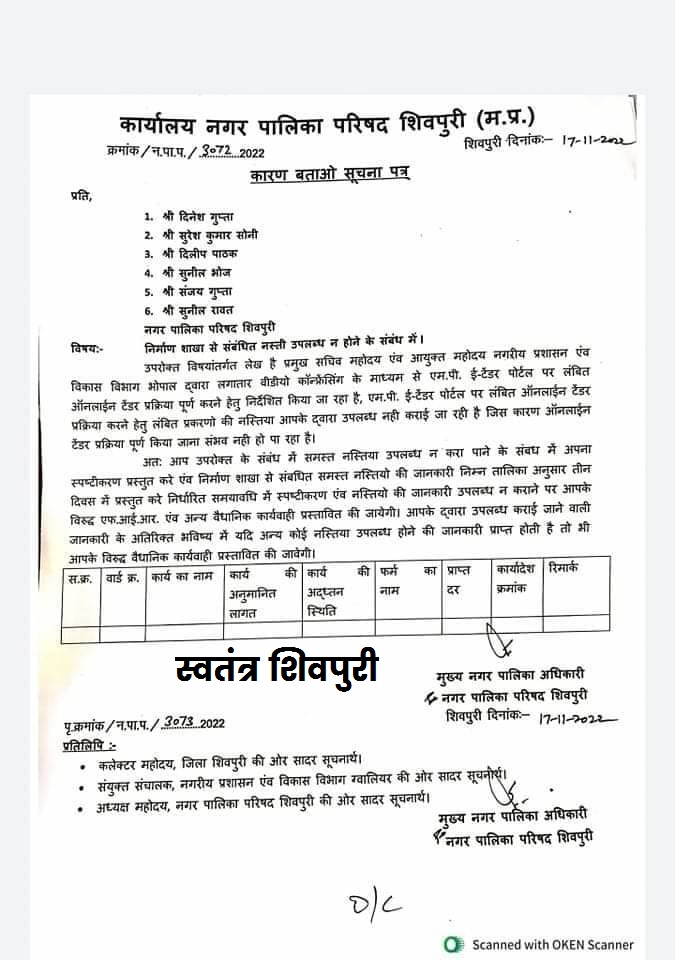 नगर पालिका शिवपुरी का ढर्रा पिछले कई महीनों से काफी बिगड़ा हुआ है। निर्माण कार्यो की नस्तियां उपलब्ध नहीं है। जिससे यह स्पष्ट नहीं हो पा रहा कि निर्माण कार्यों की स्थिति क्या है। निर्माण कार्य किस फर्म द्वारा कराए जा रहे हैं और कब तक उसे पूर्ण होना है, इसकी कोई जानकारी संबंधित कर्मचारियों द्वारा उपलब्ध नहीं कराई जा रही है। सीएमओ शैलेष अवस्थी भी अभी तक अलमस्ती के आलम में थे।