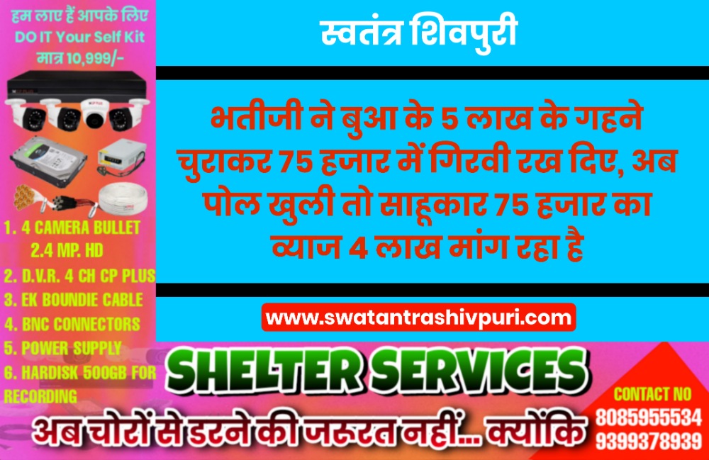शिवपुरी। आज जो खबर सामने आई है उससे रिस्तेदारो से भरोसा उठना तय है। एक महिला ने अपनी ही बुआ को निशाना बनाते हुए उसके घर चोरी करते हुए अपनी ही बुआ के गहने पार कर दिये। इतना ही नही भतीजी ने यह गहने चोरी कर इन्हें महज 75 हजार में साहूकार के यहां गिरवी रख दिया। अब जब मामला खुला तो भतीजी 75 हजार में गिरवी रखे गहने लेने गई तो उन गहनों का व्याज 3 लाख बताया गया।