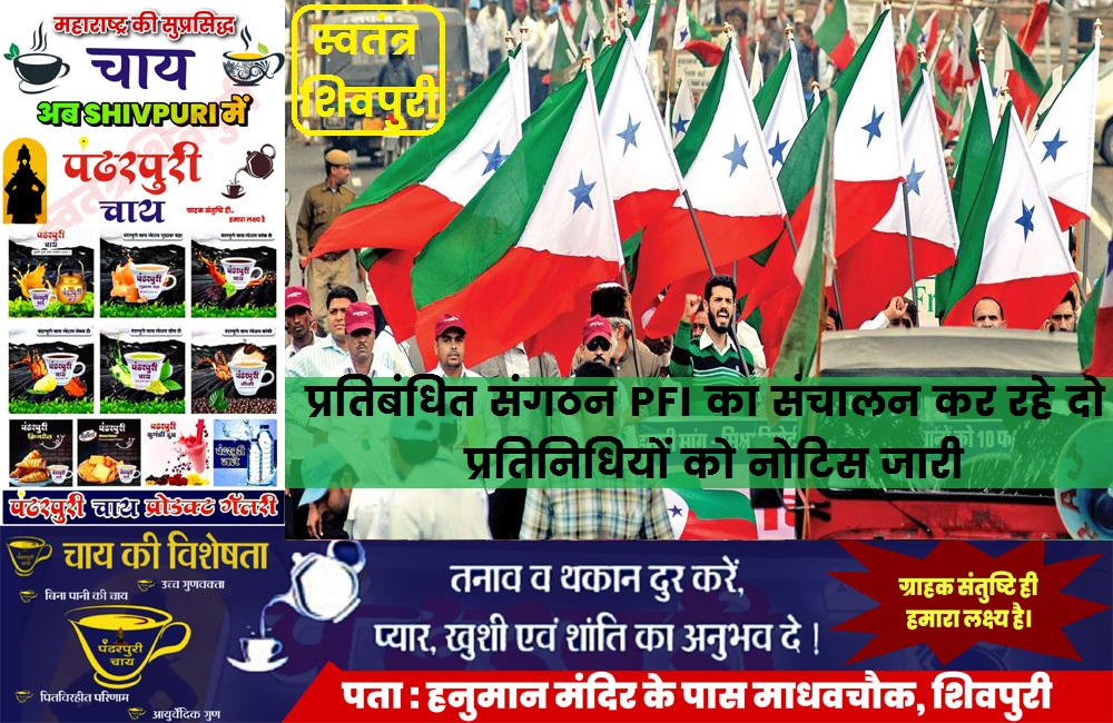 शिवपुरी। केंद्र सरकार द्वारा विधि विरुद्ध क्रियाकलाप निवारण अधिनियम 1967 के तहत पॉपुलर फ्रंट ऑफ इंडिया (पीएफआई) संगठन को प्रतिबंधित किया गया है। 28 सिंतबर 2022 को नोटिफिकेशन प्रकाशित किया है। इस संबंध में उच्च न्यायालय दिल्ली के माननीय न्यायाधीश की अध्यक्षता में गठित न्यायाधिकरण द्वारा पीएफआई संगठन और सहयोगी संगठनों को नोटिस जारी किए गए हैं।
