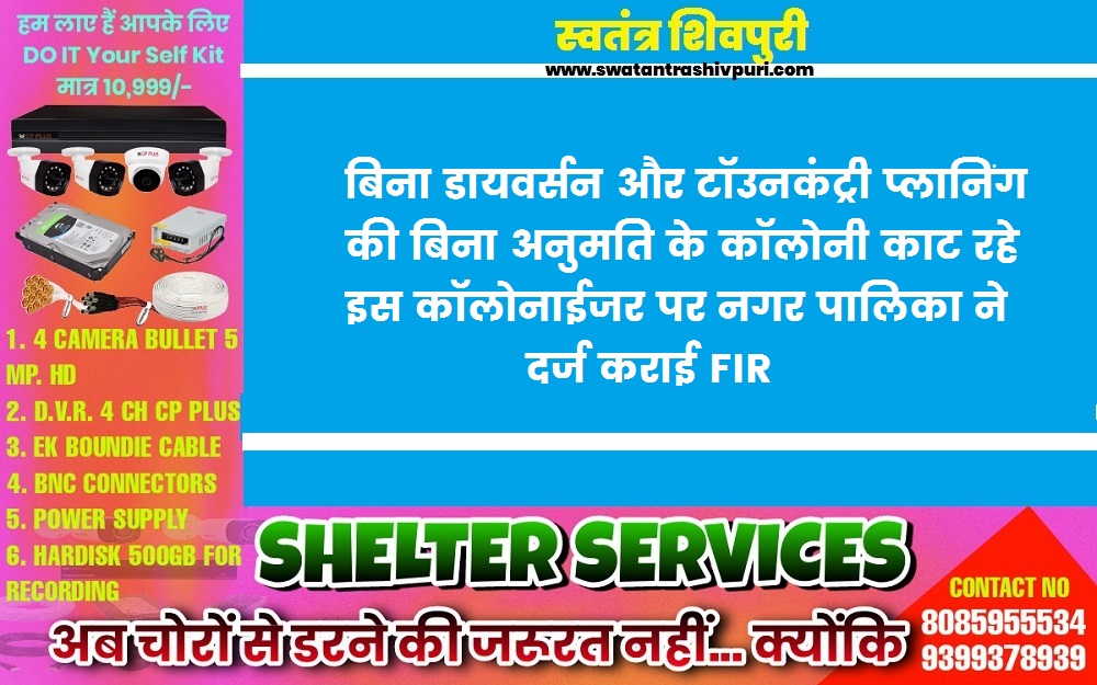शिवपुरी। अवैध कॉलोनी काटने के मामले में नगर पालिका के आरआई सुधीर मिश्रा ने एक कॉलोनाईजर शिवचरण बाथम के खिलाफ एफआईआर दर्ज कराई है। आरोपी कॉलोनाईजर मनियर क्षेत्र में सर्वे नम्बर 74 मिन-5/1 रकवा 0.266 हैक्टेयर पर प्लॉटिंग कर रहा था। जिसका न तो आरोपी ने व्यपवर्तन और न ही किसी सक्षम अधिकारी से कॉलोनाईजर लायसेंस प्राप्त किया था।