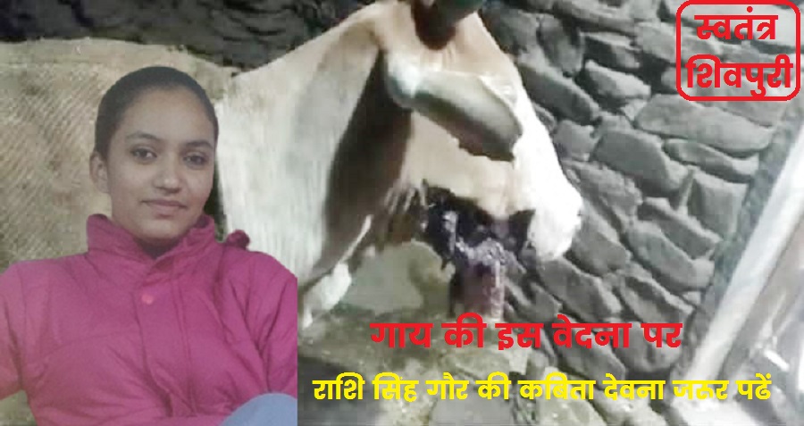 शिवपुरी। आज जिले के रन्नौद क्षेत्र में जंगली सुअरों के शिकार के लिए जंगल में बिछाए गए बारूद से एक गाय का मुंह बुरी तरह से छतिग्रस्त हो गया। गाय के इस छतिग्रस्त मुंह को देखकर शहर की बिटिया राशि सिंह गौर ने इस पर एक कबिता लिखी है। इस कबिता को आप भी पढें