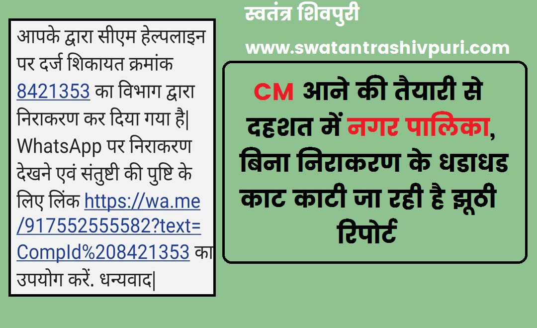 नपा के एक बाबू ने नाम न छापने की शर्त पर इस संबंध में जानकारी देते हुए बताया कि यह निराकरण मुख्यमंत्री के सामने लंबे समय से लटकी सीएम हेल्पलाइन के मामले में न आएं इसी की कवायद है। ऐसी एक शिकायत पत्रकार अशोक अग्रवाल के नाम से लगी है जो 28 मई 2019 को दर्ज कराई गई थी जिसका निराकरण तो साढ़े तीन साल बाद भी नहीं हो सका लेकिन आज s.m.s. जरूर भेज दिया गया कि आपकी शिकायत का निराकरण कर दिया गया है लेकिन अशोक अग्रवाल ने अपनी अपनी जागरूकता का परिचय देते हुए तुरंत अपनी सीएम हेल्पलाइन को अपडेट करा दिया। उनका कहना है कि इस मामले को वे अवश्य ही सीएम के समक्ष रखेंगे कि किस तरह से सीएम हेल्पलाइन का मजाक शिवपुरी नगर पालिका द्वारा बनाया जा रहा है।