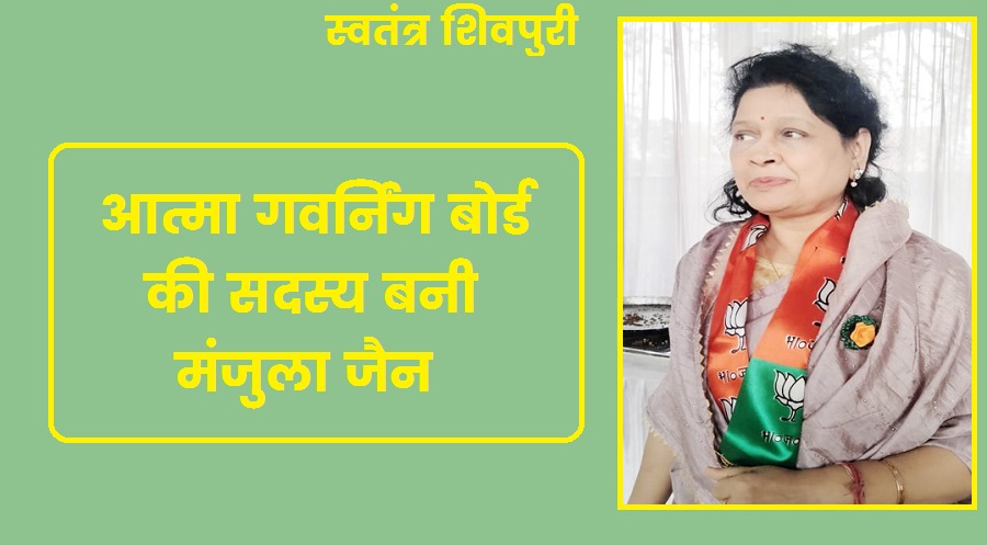 शिवपुरी। सब मिशन ऑन एग्रीकल्चर एक्सटेंशन आत्मा अंतर्गत पूर्व में गठित आत्मा गविर्निंग बोर्ड को निरस्त कर दिया गया है। कलेक्टर सह अध्यक्ष आत्मा गवर्निंग बोर्ड द्धारा नवीन आत्मा गावर्निंग बोर्ड शिवपुरी का गठन किया गया है। जिसमें भाजपा जिला उपाध्यक्ष मंजुला जैन को विकास खंड शिवपुरी महिला समूह श्रेणी का कृषक प्रतिनिधि बनाया गया है। मंजुला जैन के उपाध्यडक्ष बनने पर अनेक लोगों ने खुशी जाहिर की है।