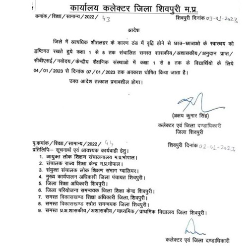 शिवपुरी। बीते दो दिन से शहर में शीत लहर चल रही है। जिसके चलते इस शीत लहर में बच्चे स्कूल जा रहे है। इसको ध्यान में रखते हुए शिवपुरीे कलेक्टर अक्षय कुमार सिंह ने कल यानी 4 जनवरी से 7 जनवरी तक सभी शासकीय,अशासकीय और अर्धशासकीय स्कूलों की कक्षा 8 तक की छुट्टी घोषित की है।