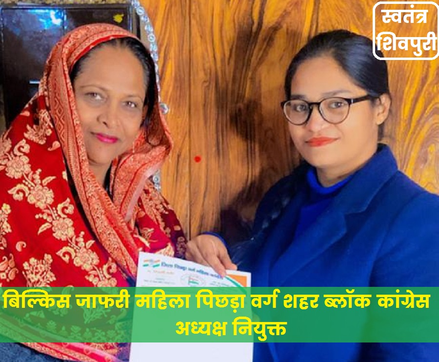 शिवपुरी। महिला पिछड़ा वर्ग कांग्रेस की जिला अध्यक्ष कु. शिवानी राठौर द्वारा संगठन का विस्तार करते हुए प्रदेश कांग्रेस अध्यक्ष कमलनाथ जी के आदेशानुसार एवं पूर्व मंत्री एवं विधायक के पी सिंह कक्काजू, प्रदेशाध्यक्ष पिछड़ा वर्ग सिद्धार्थ कुशवाहा, जिला प्रभारी रश्मि पवार जी एवं जिला कांग्रेस अध्यक्ष श्रीं प्रकाश शर्मा जी की अनुशंसा से बिल्किस जाफरी को महिला पिछड़ा वर्ग शहर ब्लॉक कांग्रेस शिवपुरी की शहर अध्यक्ष नियुक्त किया गया।